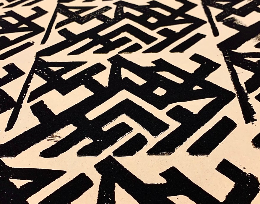A maze like geometric graphic repeated to creat an op art piece with bold contrast. The medium is 4”x6” Lino print with water based ink on an old newsprint roll. This was printed in a pattern on three 2.5’x8’ sections to be used for a backdrop used in studio photography. Stamping process took 5 weeks working in roughly 30 minute sessions twice a week.