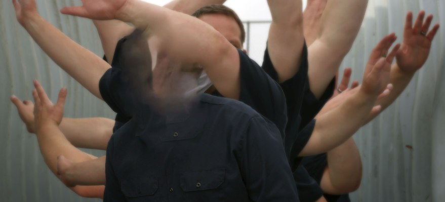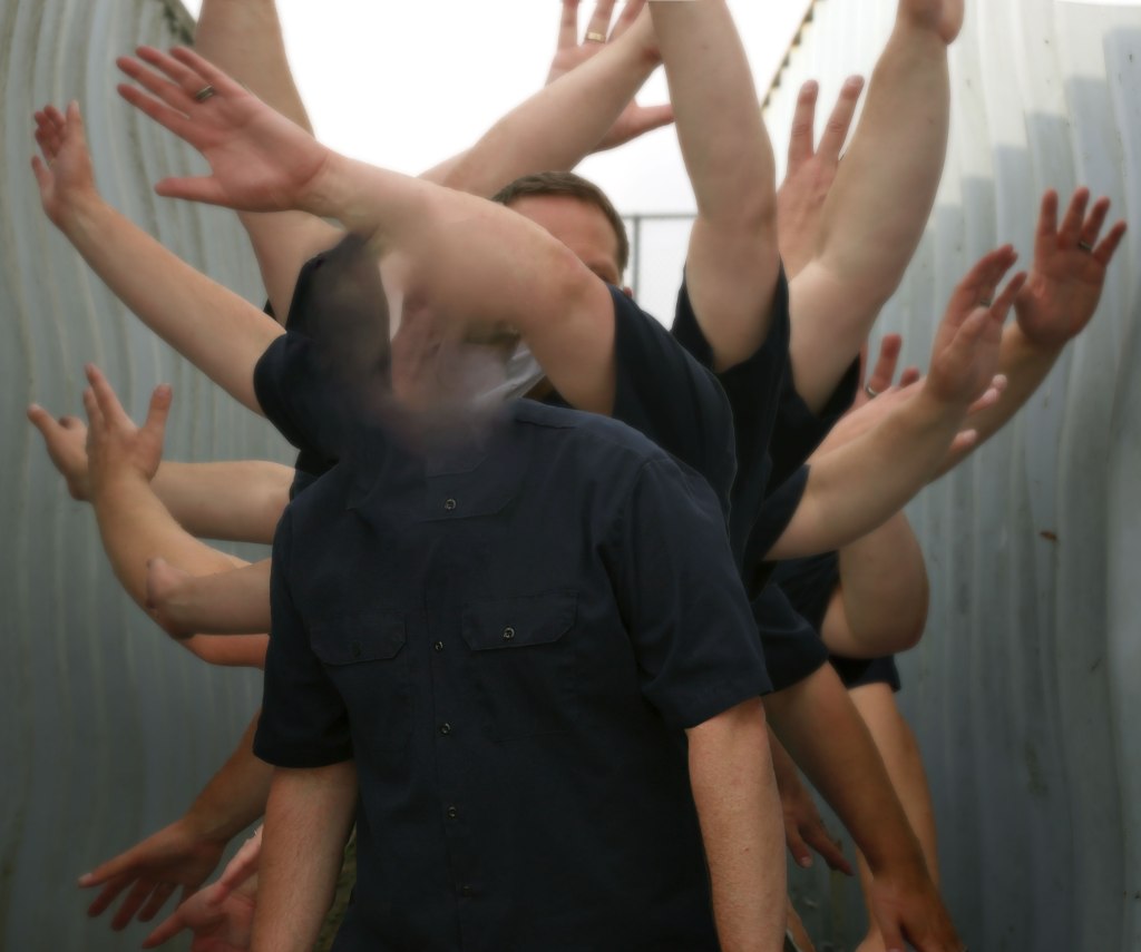 Photography study using chrono technique while waving arms in circle. Face was removed/distorted using content aware fill in Photoshop. First loading files into stack and using align layers function. Layer masks were applied hastily using subject selection.
